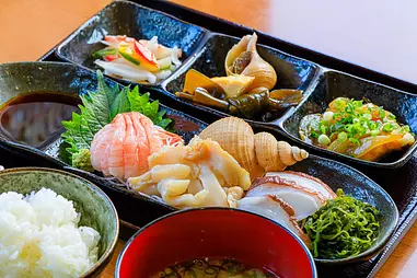 函館朝市海鮮丼の元祖。こだわりは近海の新鮮なネタと道南産米の炭火炊きご飯で、元祖函館巴丼が人気。朝市に本店、支店あり。ベイエリア店は夜も営業。昭和31年創業。