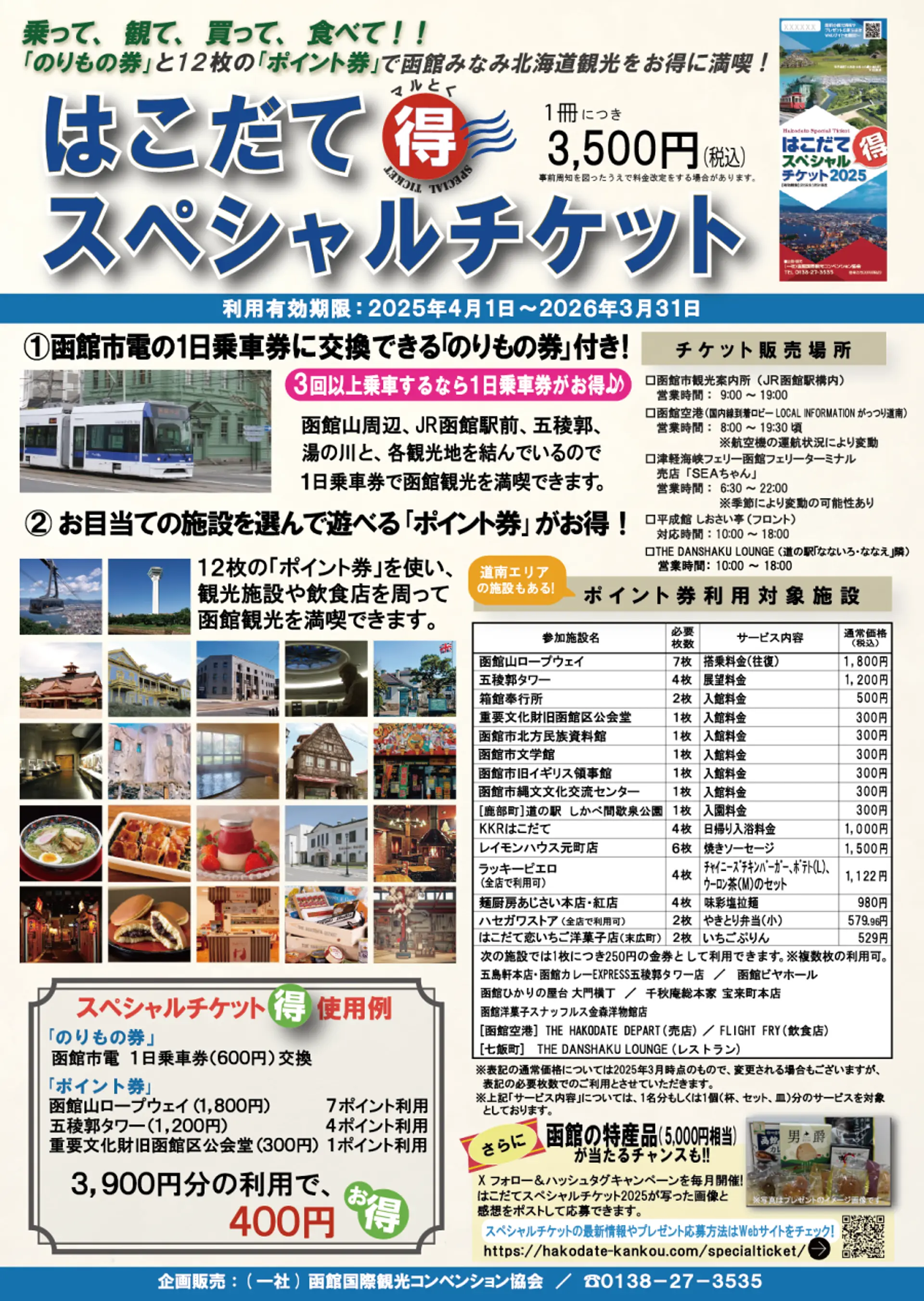 函館観光に便利な「のりもの券」と、人気施設・飲食店で使える「ポイント券」がセットになった「はこだてスペシャルチケット」。