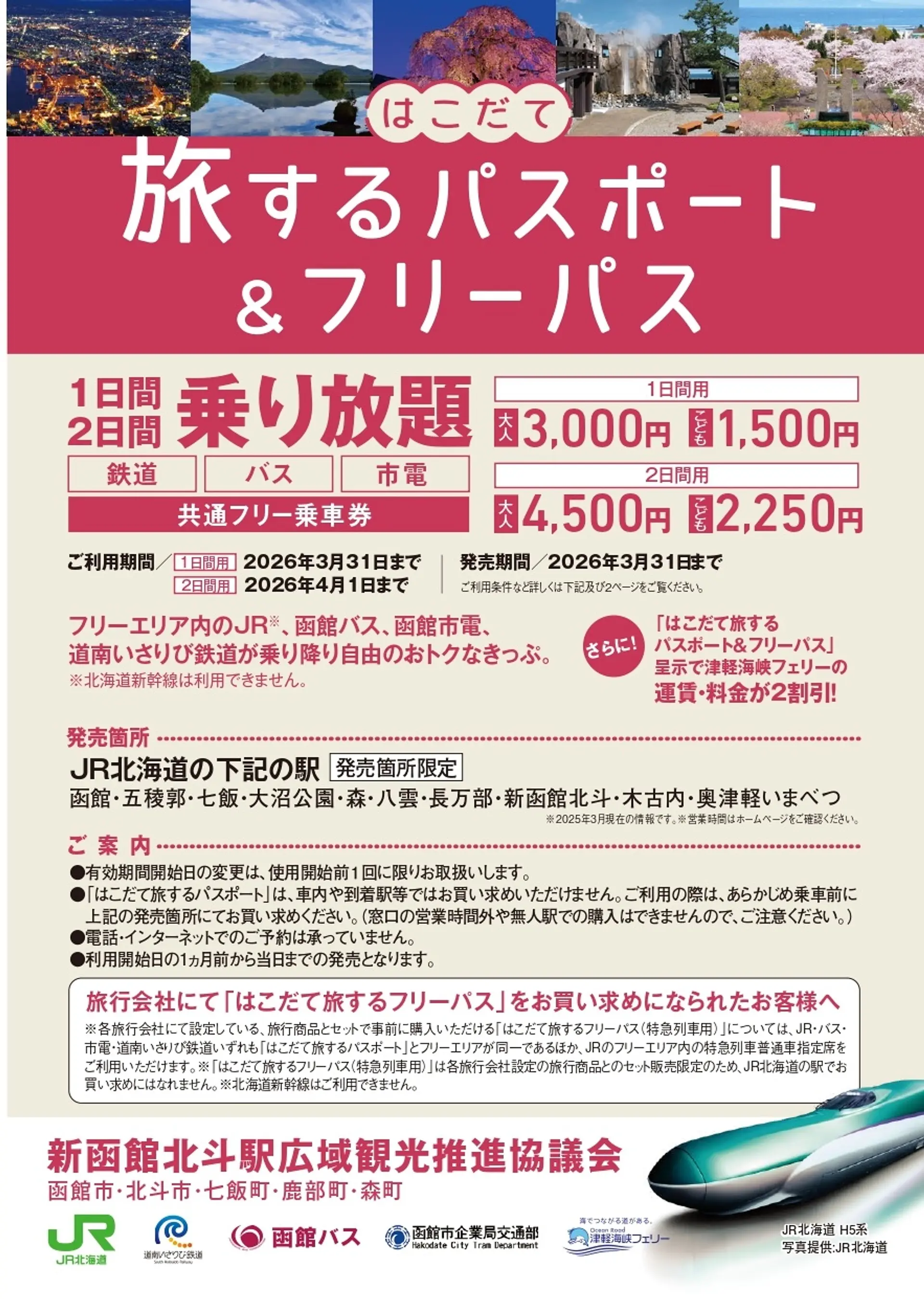 お得な共通フリー乗車券「はこだて旅するパスポート」。函館と近郊(北斗市、七飯町、鹿部町、森町、木古内町)限定で、JR線(普通列車)、函館バス、函館市電、道南いさりび鉄道が乗り放題!