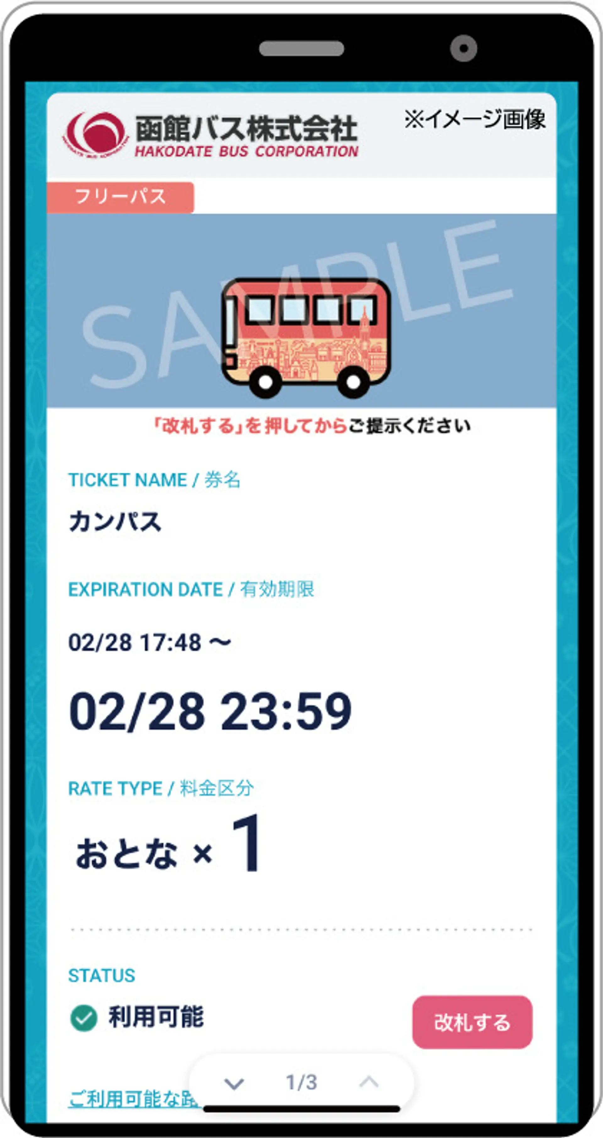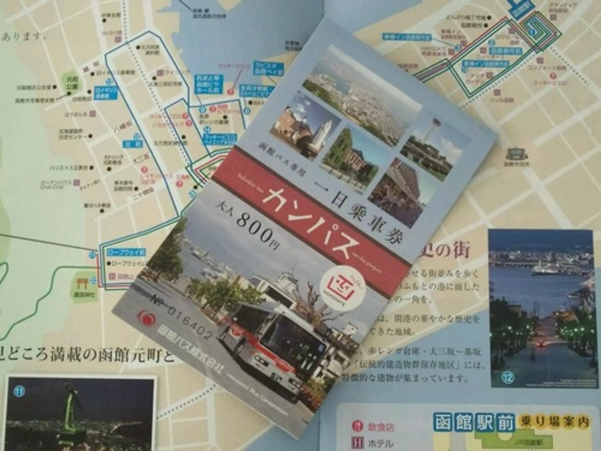 函館山登山バスをはじめ、元町・ベイエリア周遊号、五稜郭タワー・トラピスチヌシャトルバスなど、函館バスの函館市内の指定範囲内の路線が1日乗り放題の乗車券、カンパス。